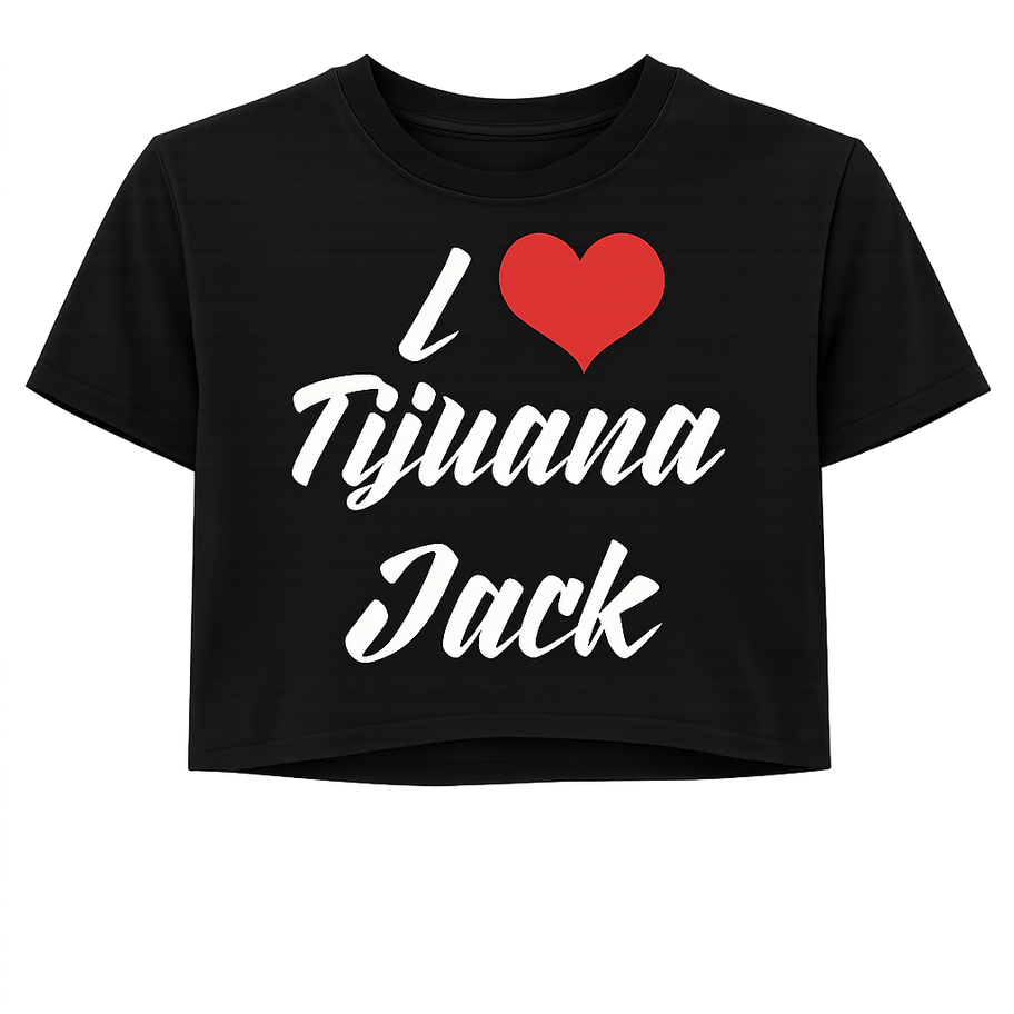 A bold black cropped t-shirt with the I Love Tijuana Jack print in high-contrast white and red.Designed for confident, fashion-forward looks and effortless styling.